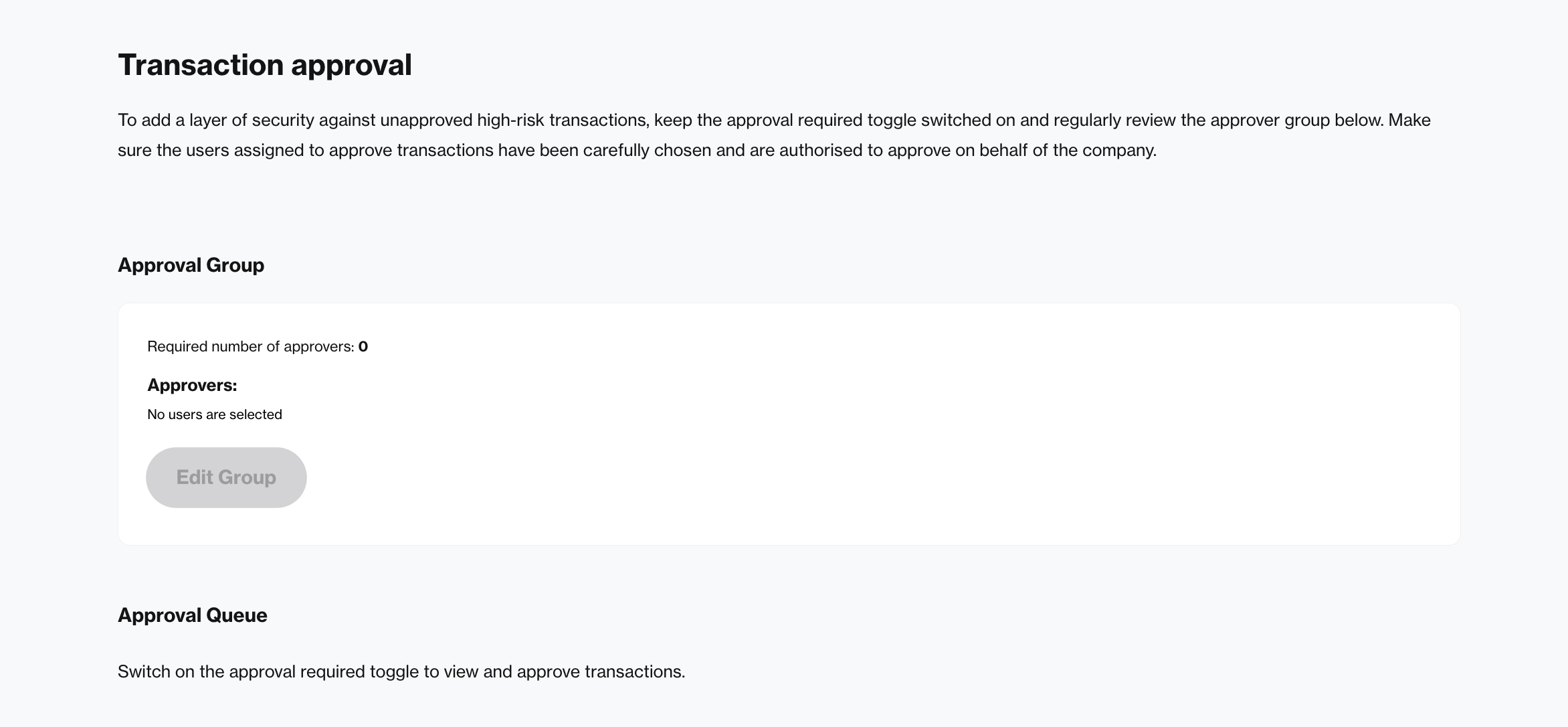 Transaction approval rules add an extra layer of security against unapproved high-risk transactions by requiring designated users to approve payments before they're processed. Ensure that the users assigned to approve transactions have been carefully chosen and are authorised to approve on behalf of the company. Review the approvers regularly.