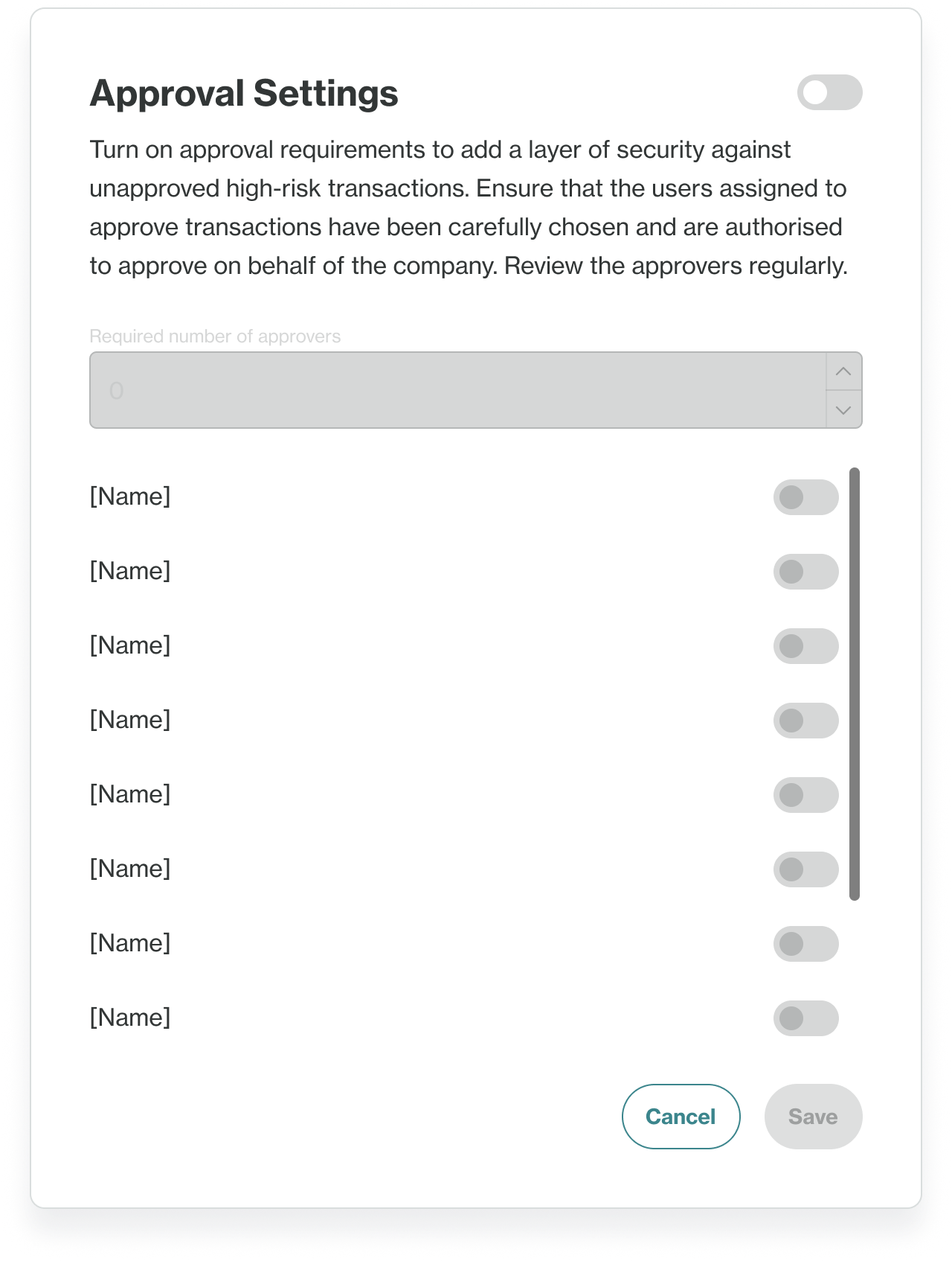 - Select approvers: Toggle on the names of users you want to approve transactions