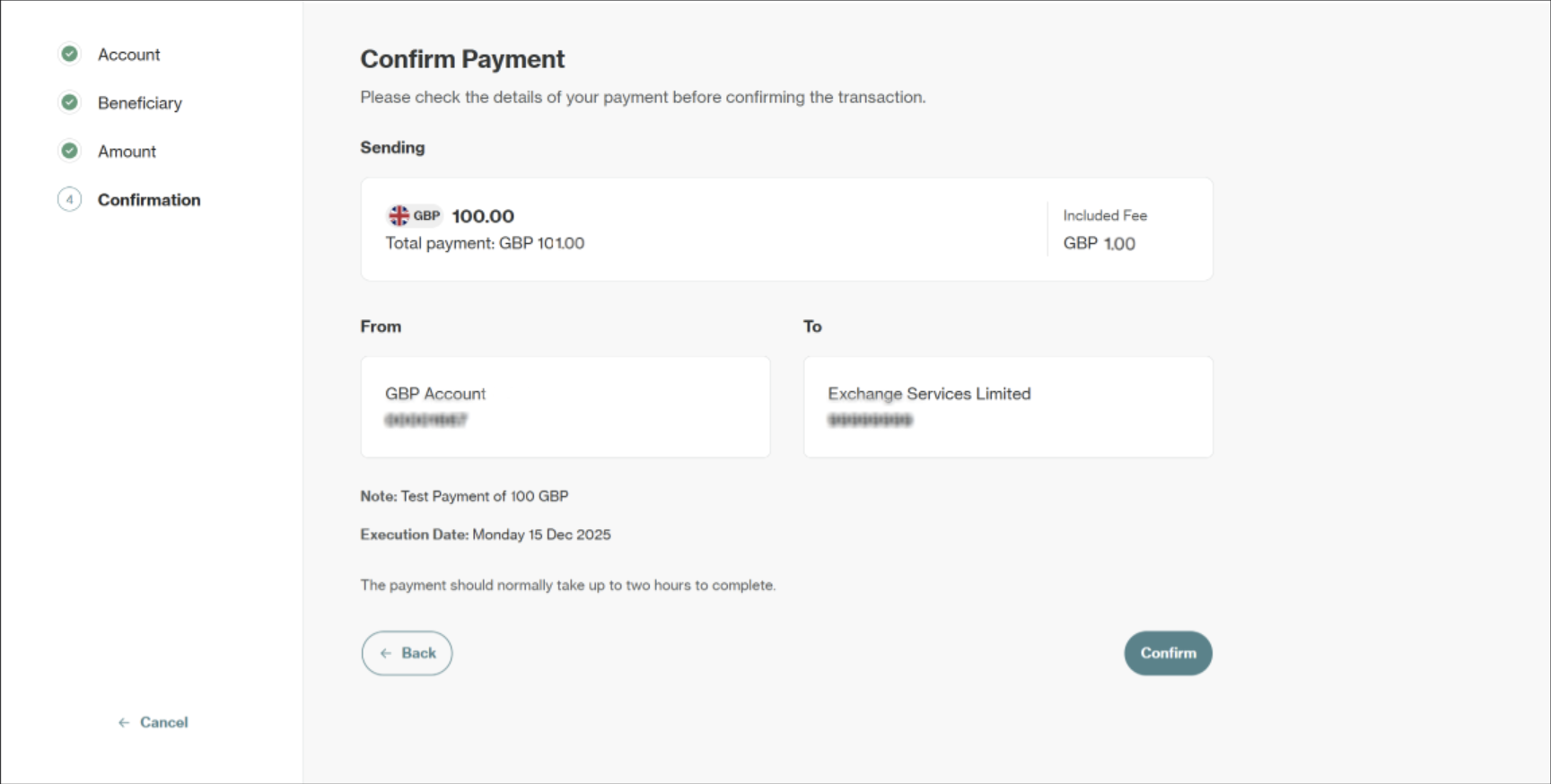 1. On the Confirmation screen, carefully review the full payment summary including sending amount, fees, source account, beneficiary details, and execution date.