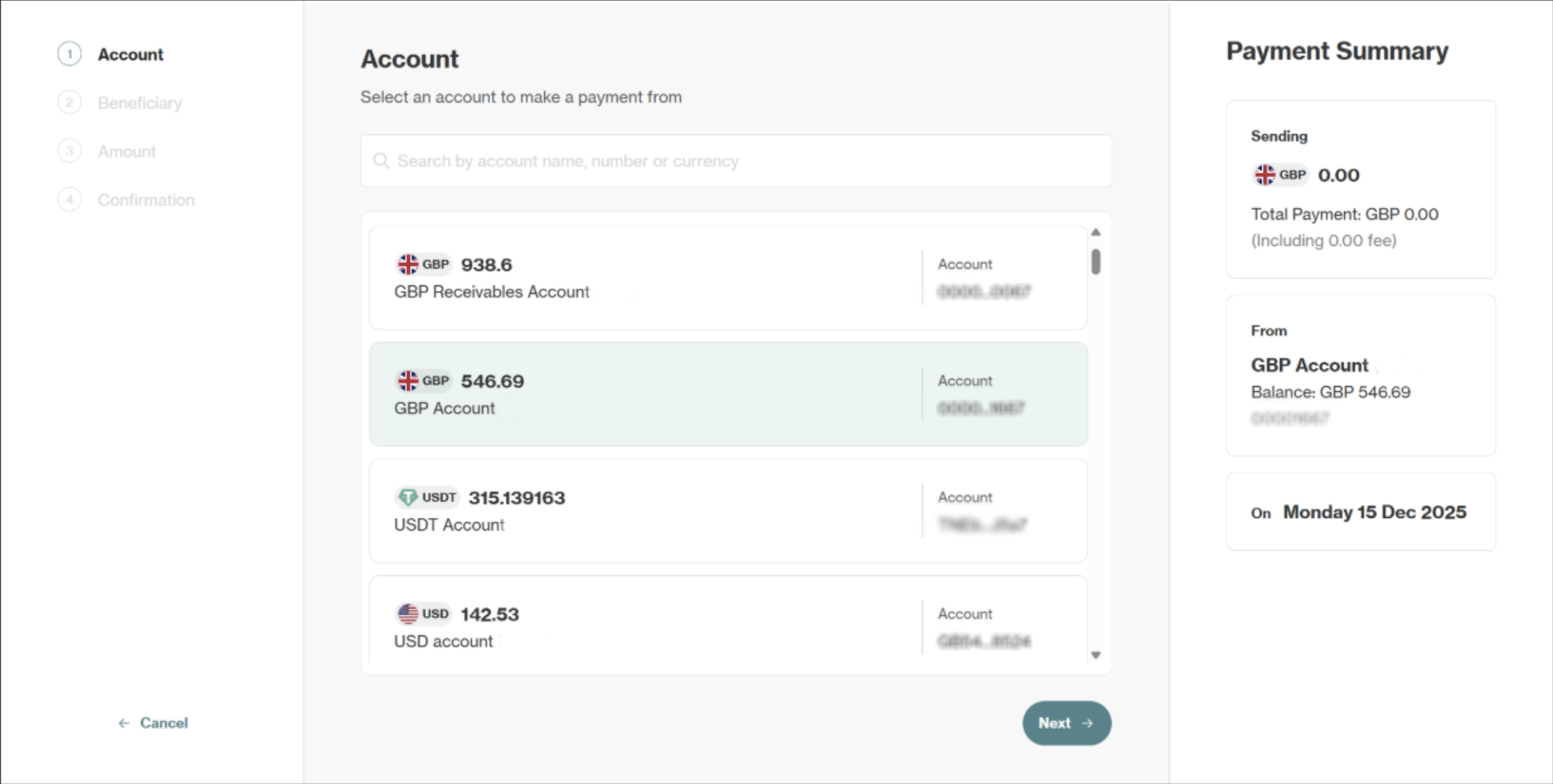 This opens the payment workflow, where you’ll complete each step in sequence: Account → Beneficiary → Amount → Confirmation.