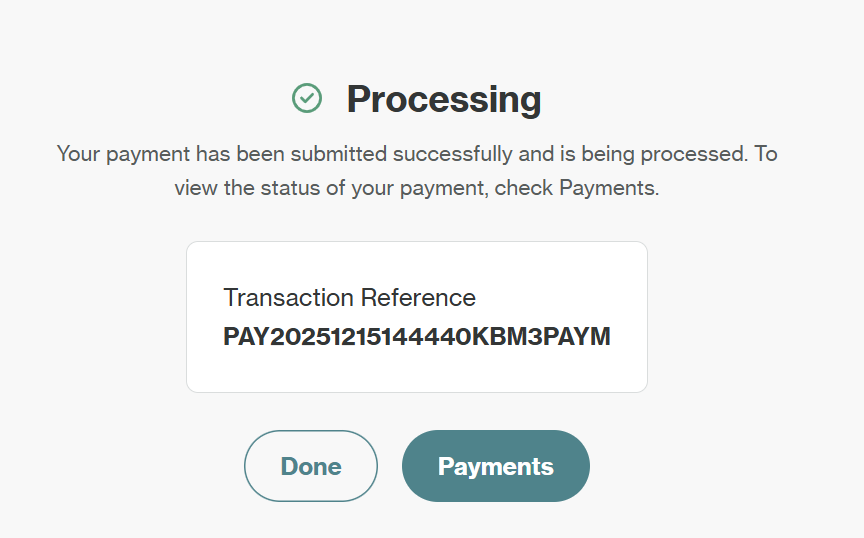 Once submitted, your payment will show as Processing with a generated transaction reference for tracking. You can monitor payment status under Payments → Pending Payments.