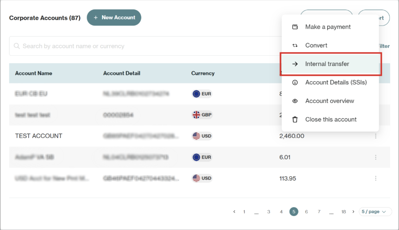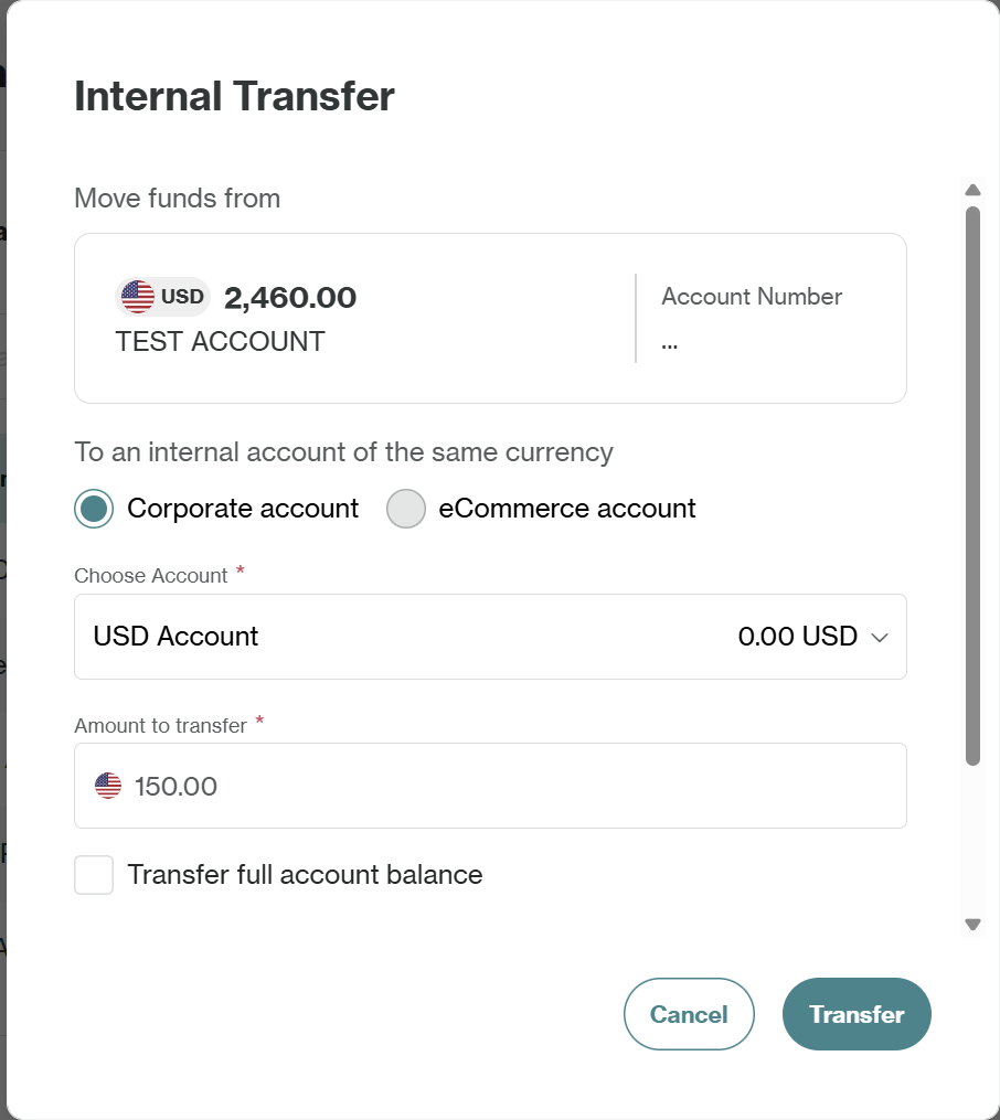 Internal transfers allow you to move funds between your own accounts of the same currency. This functionality is useful for tasks like topping up an eCommerce account using your Corporate balance, or consolidating funds back into your main Corporate account.