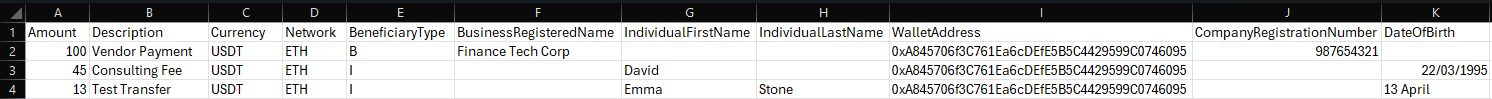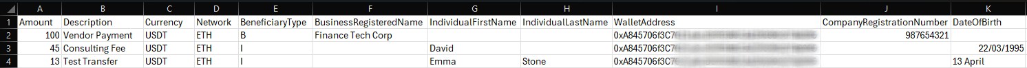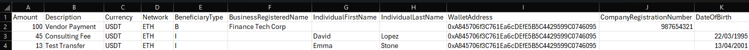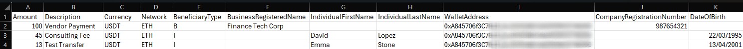 Network | For USDT/USDC, the blockchain/network of the currency to be sent to the beneficiary's account | Conditional: Mandatory if Currency is USDT or USDC Must match the network of the PMID you selected to fund the Mass Payout For USDT: TRX, ETH, MATIC, TON, BNB For USDC: SOL, ETH, MATIC, TRX, BNB |