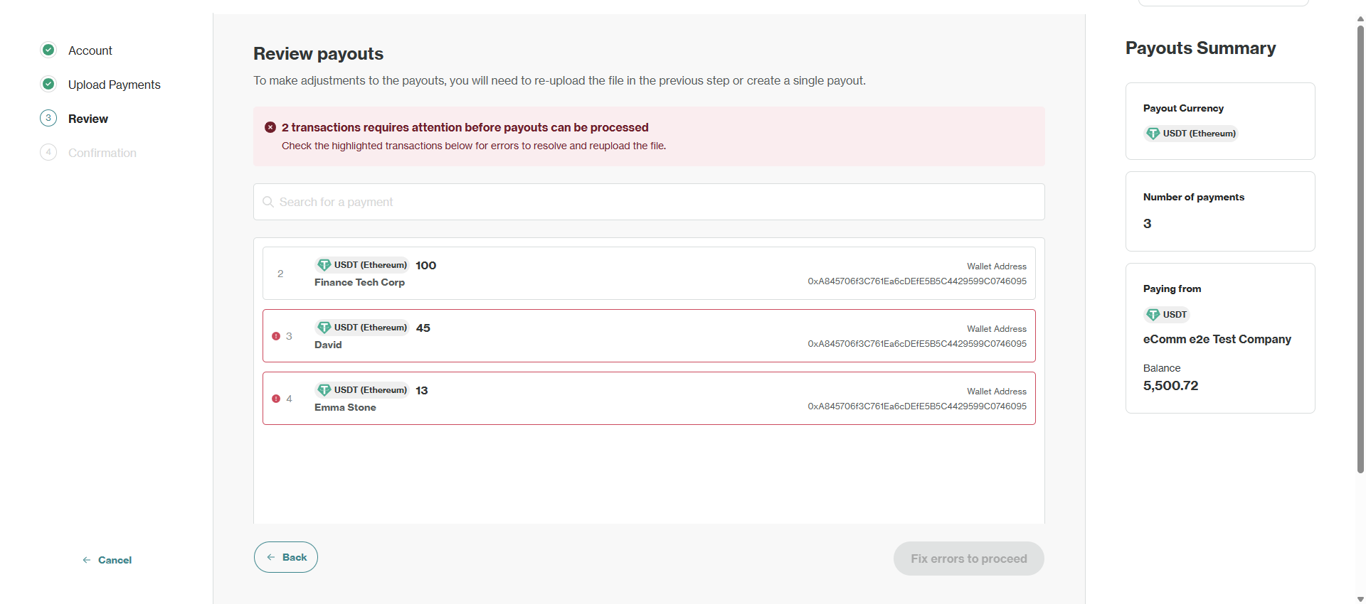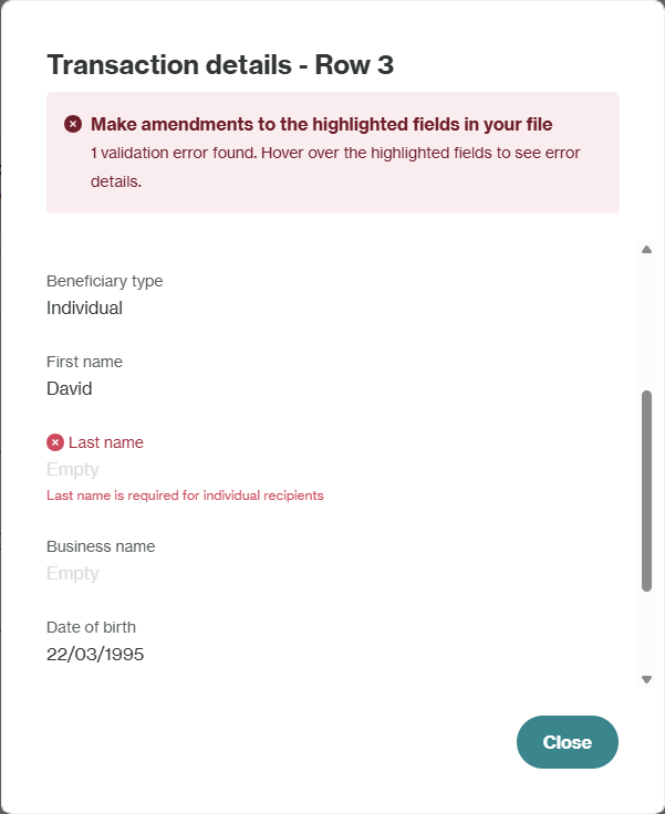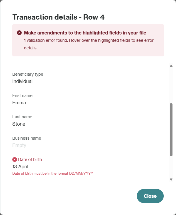 Missing Data: If you have missed a mandatory data field for a payout, you will see an error in the Review page when you click into the flagged payout. You will need to return to your file and add this data before reuploading.