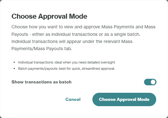 - Individual Approval Mode: Each individual payout within the Mass Payout will appear in the approval queue. You will approve/reject each individual payout separately. This is ideal for detailed oversight.