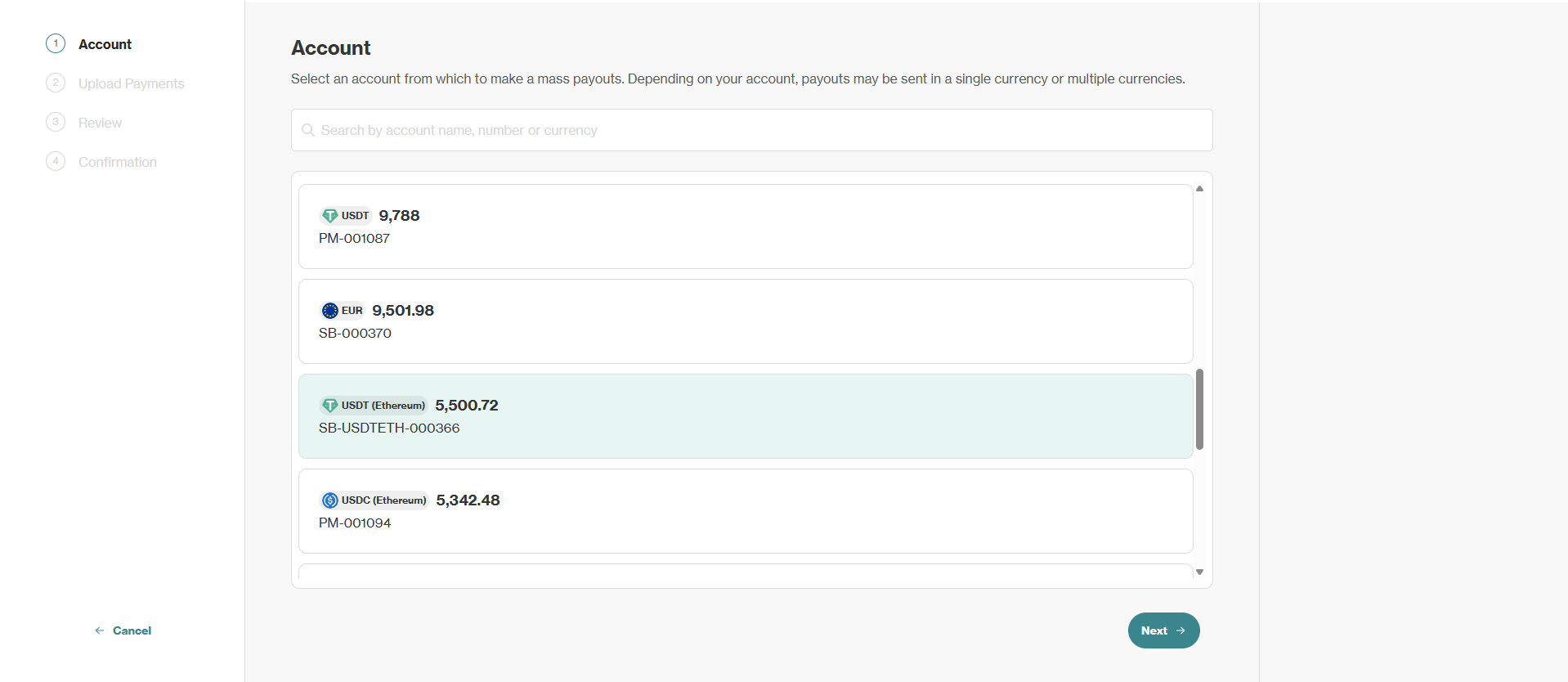 - Next, choose the account/PMID you want to use to fund the Mass Payout.