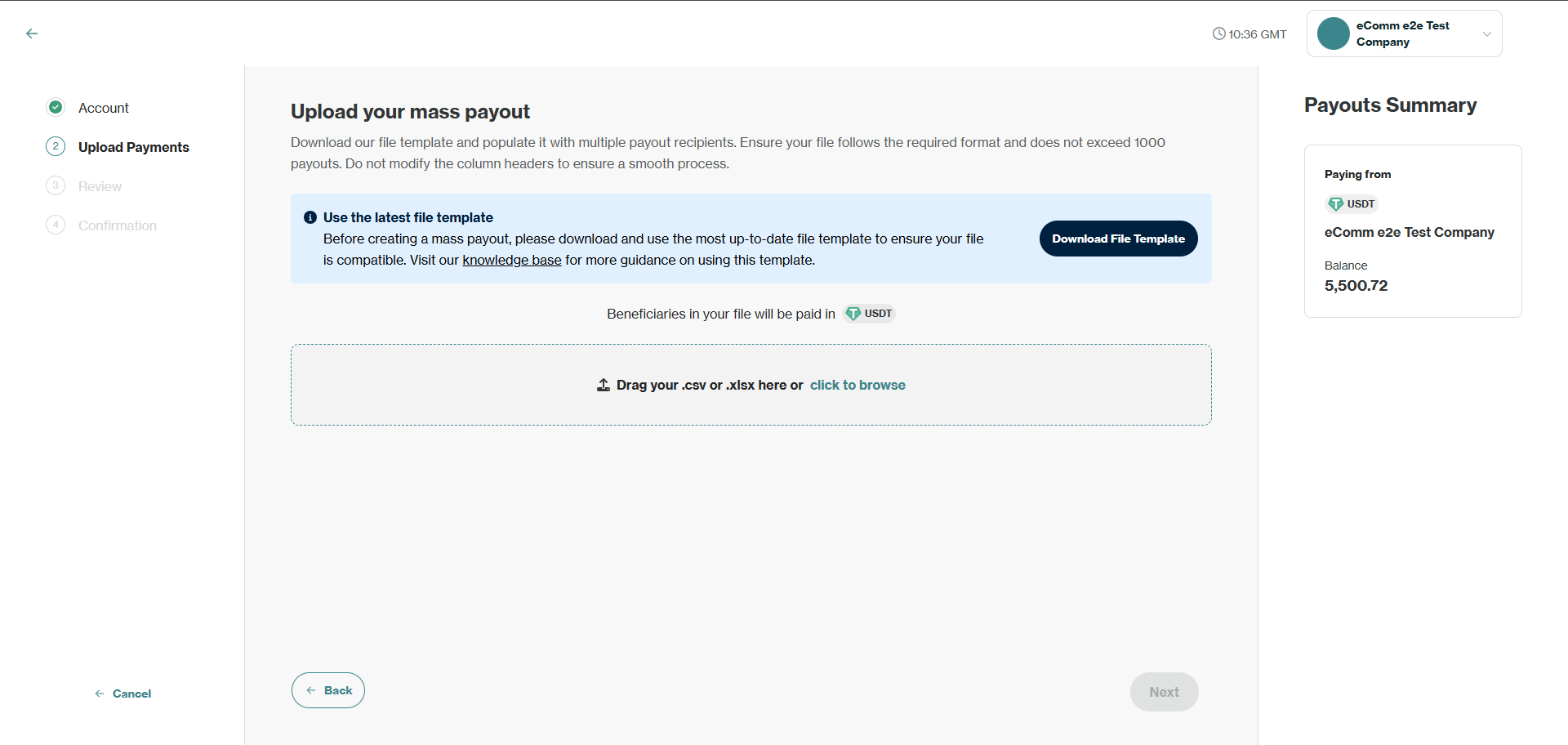 - Note that auto-conversion is only available for fiat PMIDs, hence if you select a crypto PMID, all payouts within the Mass Payout file will need to match the currency (and network for USDT/USDC) of the PMID.