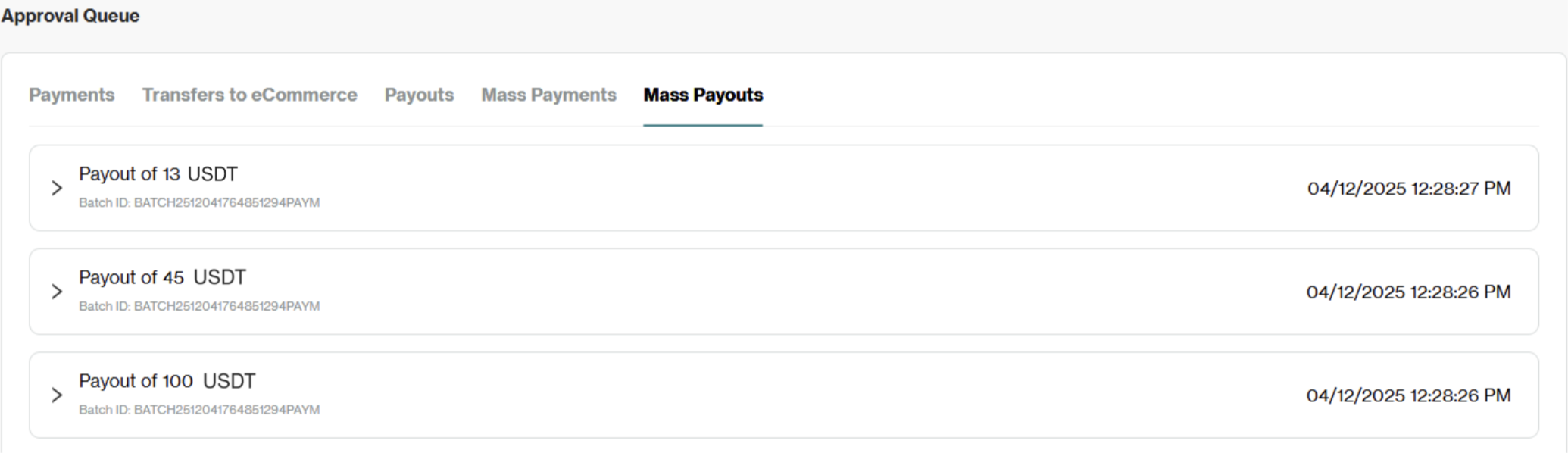 All individual payouts from the Mass Payout will appear in the Approval Queue under the Mass Payouts tab.