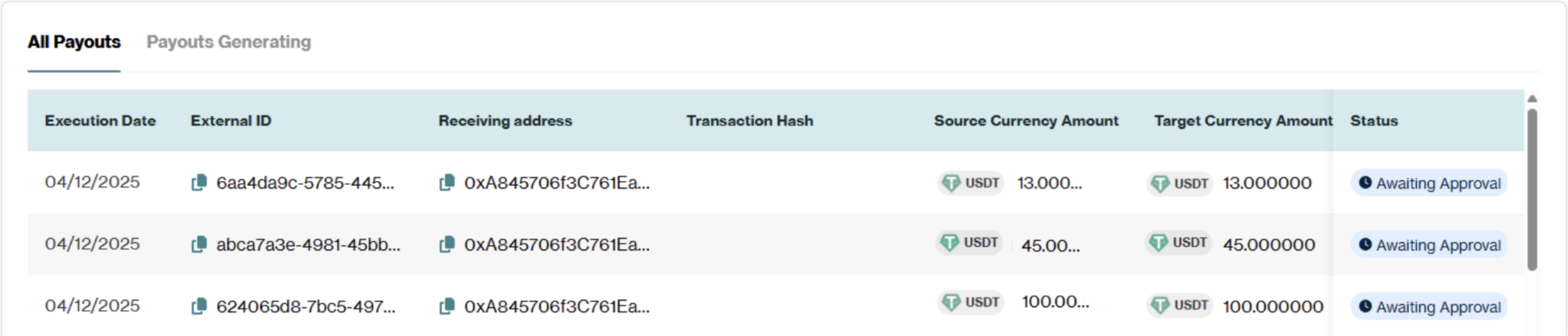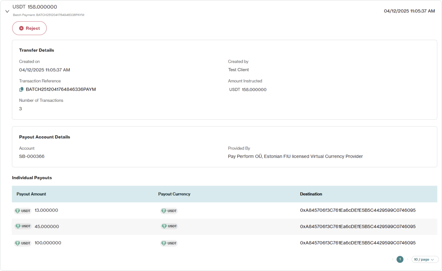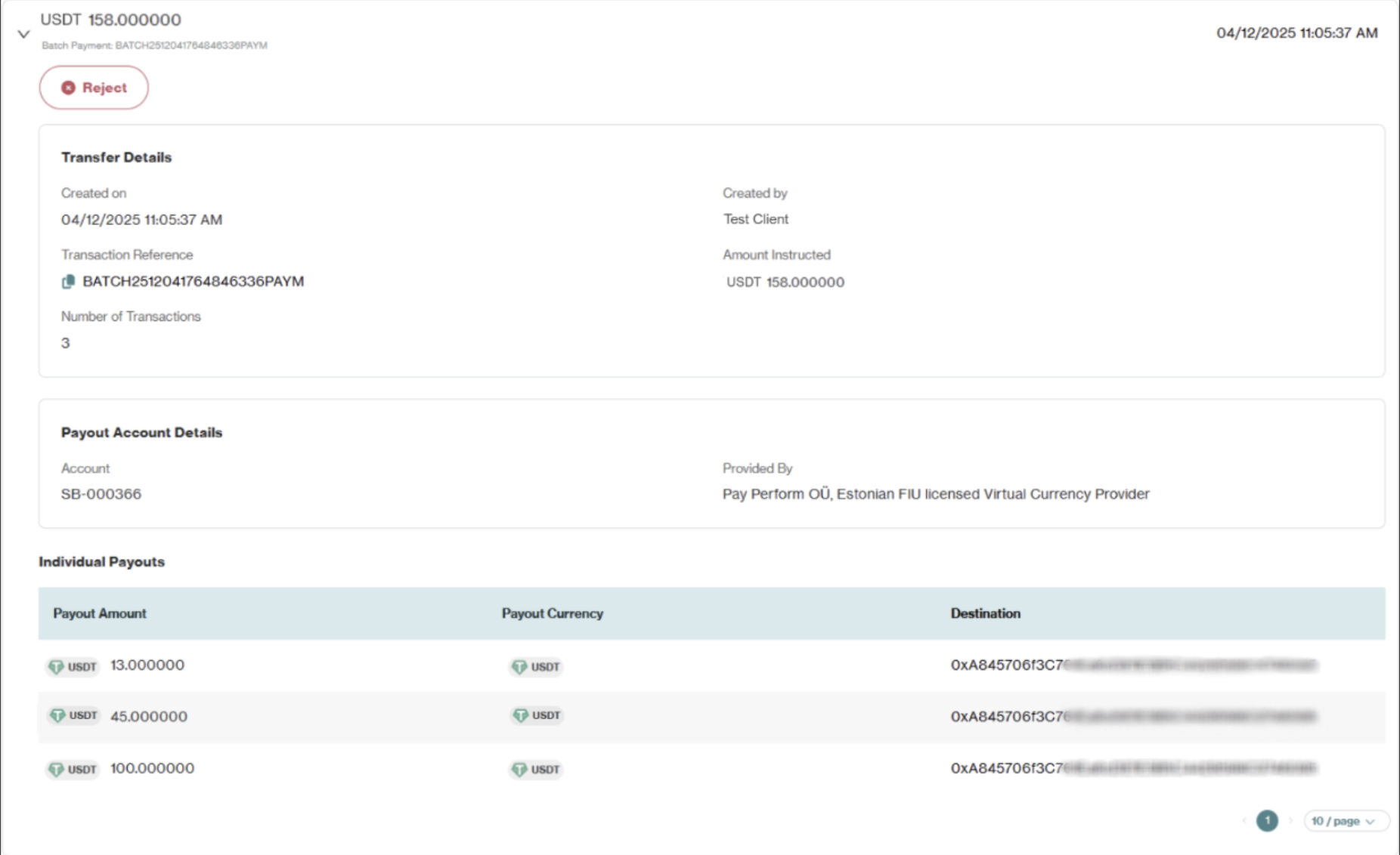 Follow the regular approval process to approve or reject each payout from the Mass Payout. Due to the instantaneous nature of crypto payouts, it is virtually impossible to stop or cancel a transaction once the process has started. Please verify carefully before approving.