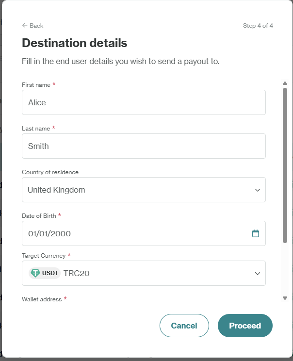 - Fill out the details of the recipient, including all relevant Travel Rule information for that particular payout, the target currency and associated wallet address. Required data may include: