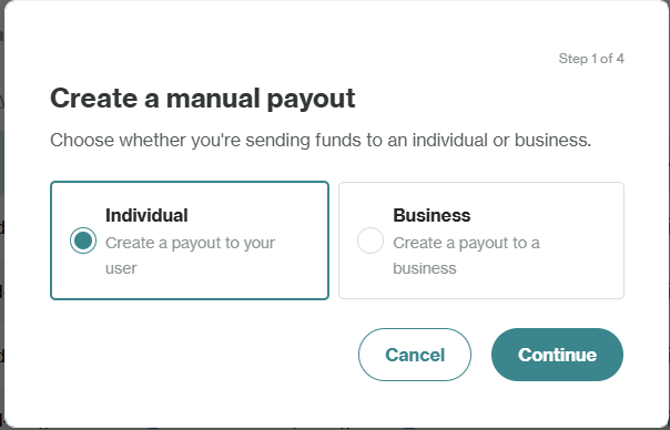 Click Create Payout → Single Payout to proceed to the Create a manual payout modal.