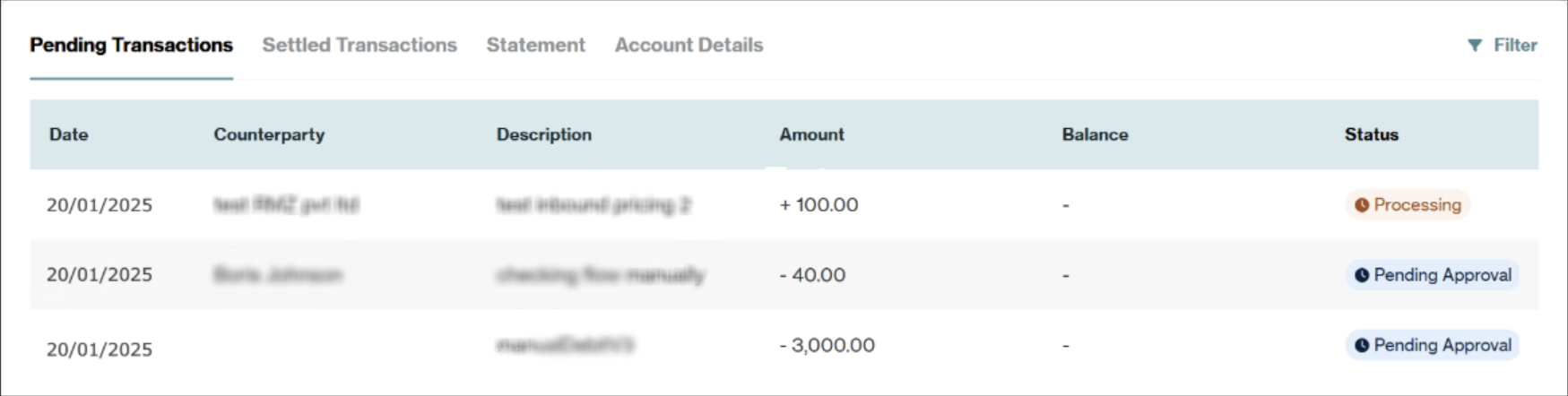 These views allow you to actively monitor pending activity and maintain a full record of all settled transactions across your accounts.