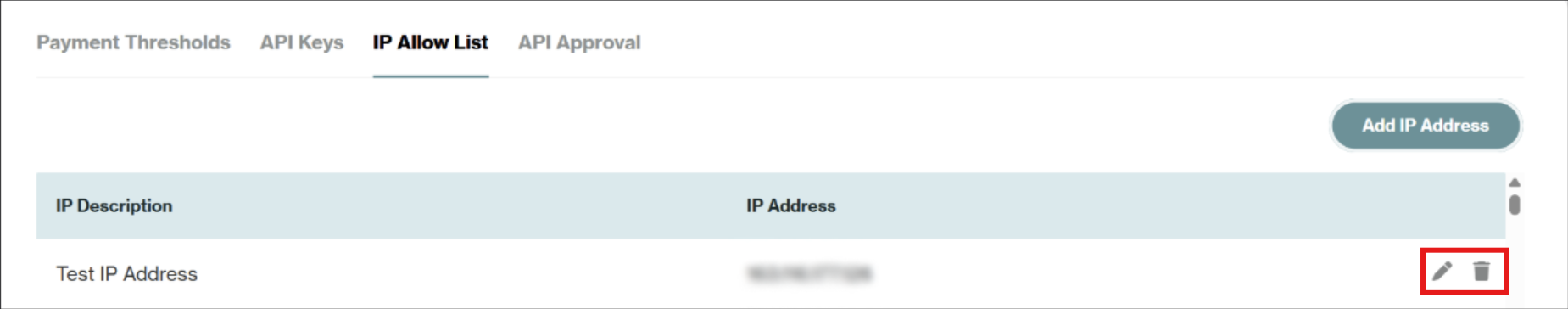 The IP Allow List tab displays all the IP addresses you have added, along with the labels you assigned to them. From here you can: