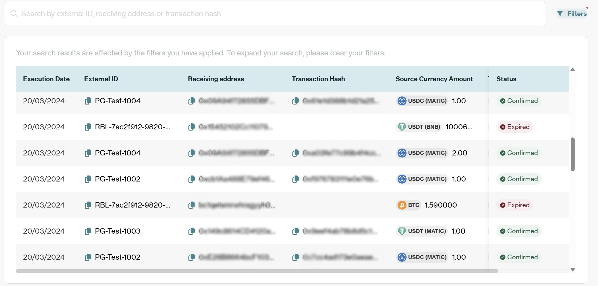 - To locate specific transactions you can use either the search bar or apply Filters to narrow results by criteria such as date, status, or currency.