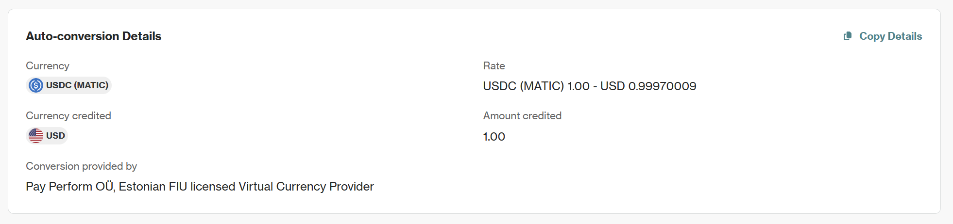 If your pay-in involved an automatic currency conversion, this section will show the details of that process.