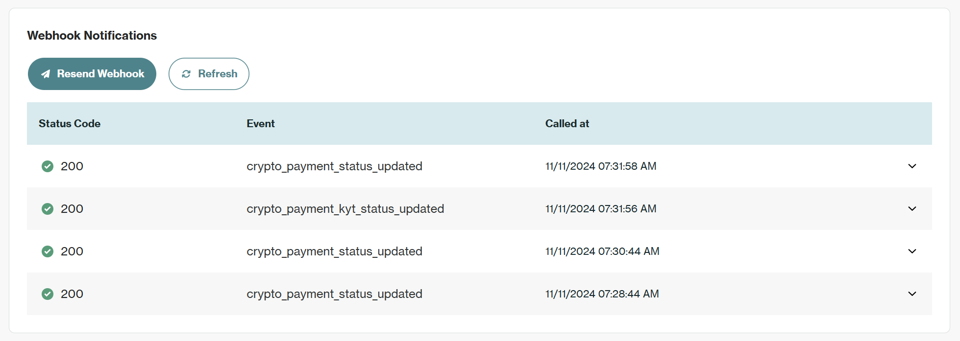 This section shows the status of any automated webhook notifications sent for this transaction.
